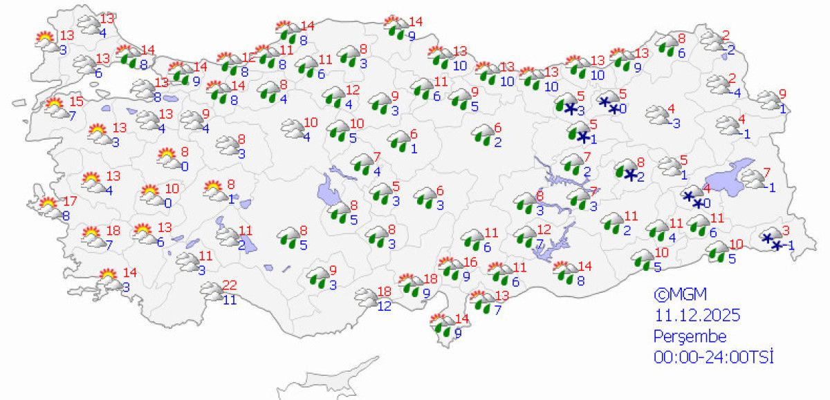 Kuzey ve doğu bölgelerde sıcaklıklar sıfırın altına yaklaşırken, batı ve güneyde 11-15 derece bandı korunacak.