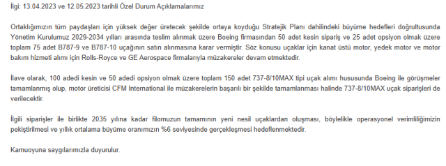 THY’nin Kamuyu Aydınlatma Platformu’na (KAP) yaptığı açıklamada, söz konusu uçakların kanat üstü motor, yedek motor ve motor bakım hizmeti için Rolls-Royce ve GE Aerospace firmalarıyla müzakerelerin devam ettiği belirtildi.
